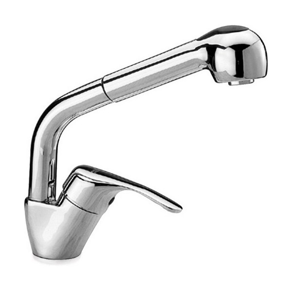 Single-control mixer for sink with swivel spout and pull-out handshower.