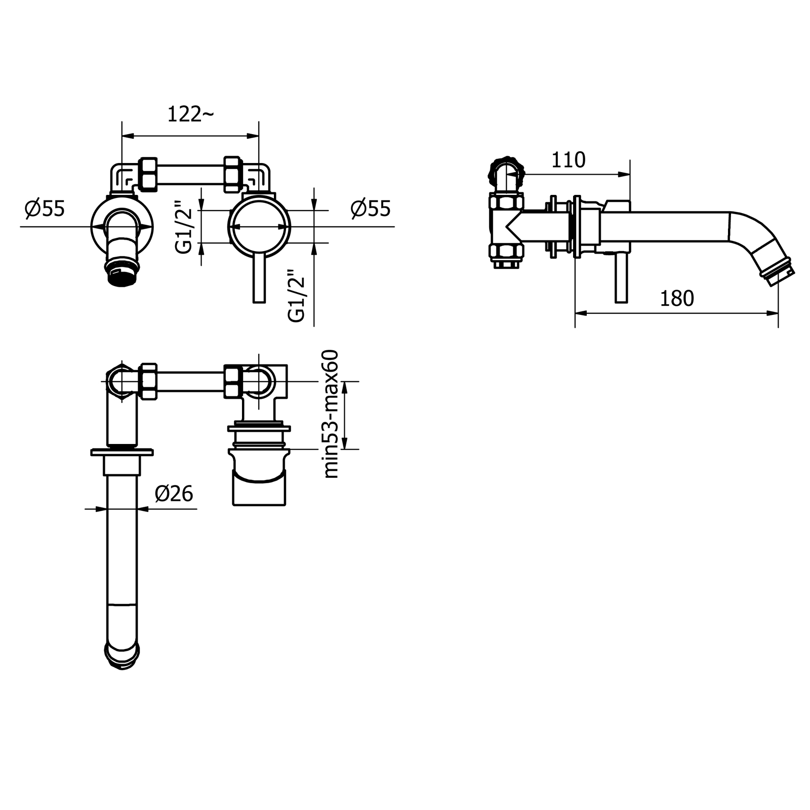 Built-in washbasin mixer with wall spout, without waste