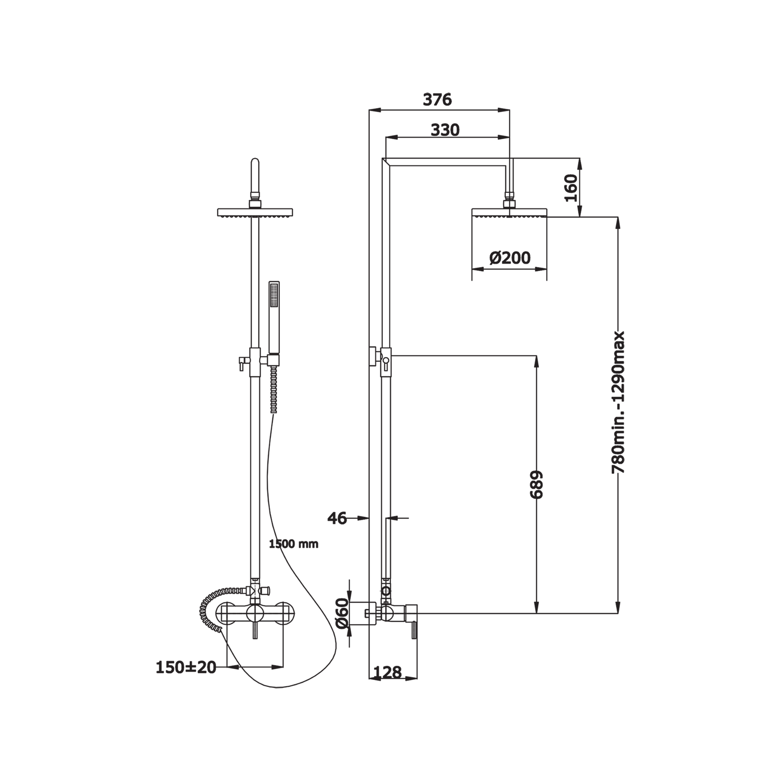 Colonne réglable de douche télescopique avec mitigeur de douche, inverseur automatique, complet avec rose auto-nettoyant et kit de douche.