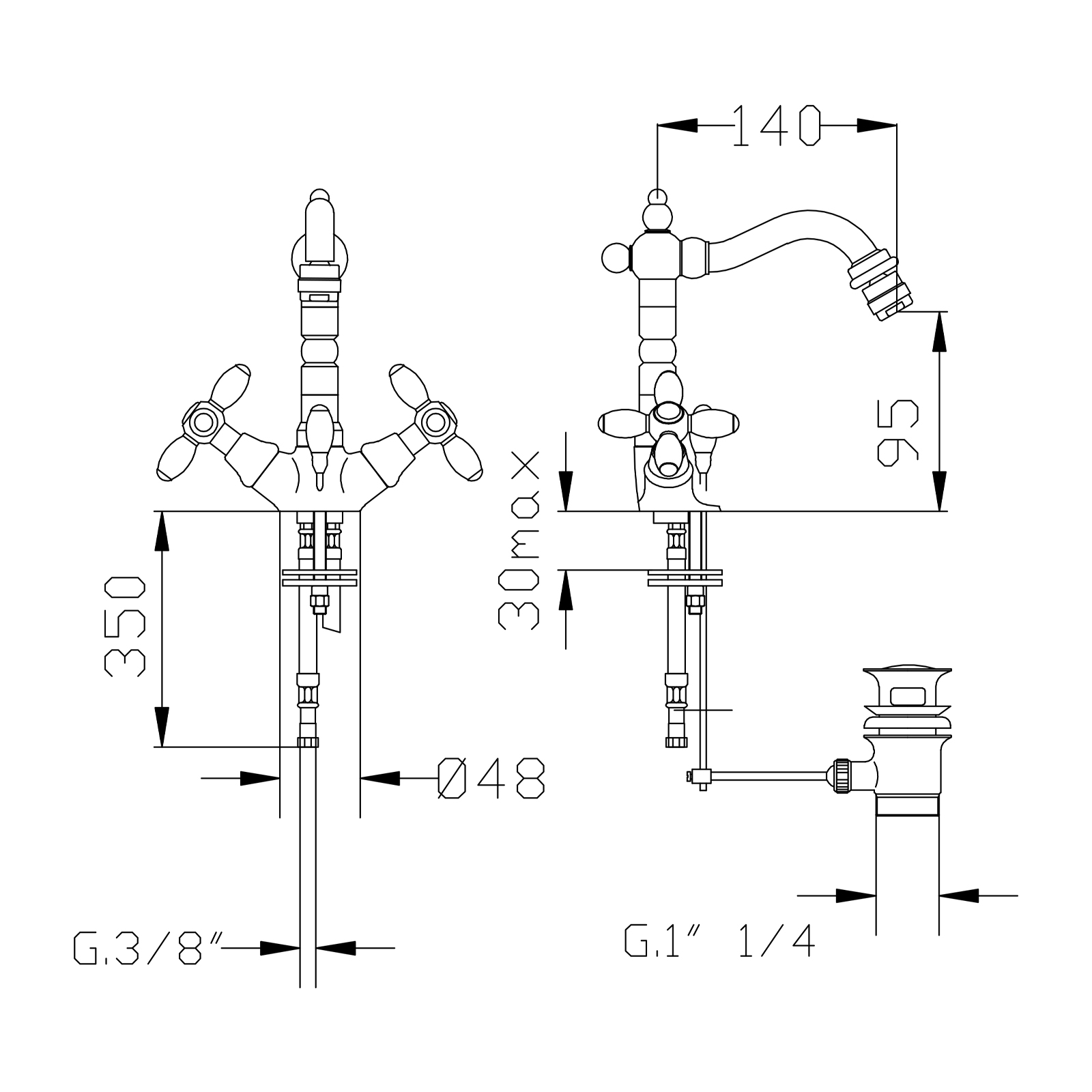Gruppo monoforo bidet con canna antica girevole e scarico automatico.